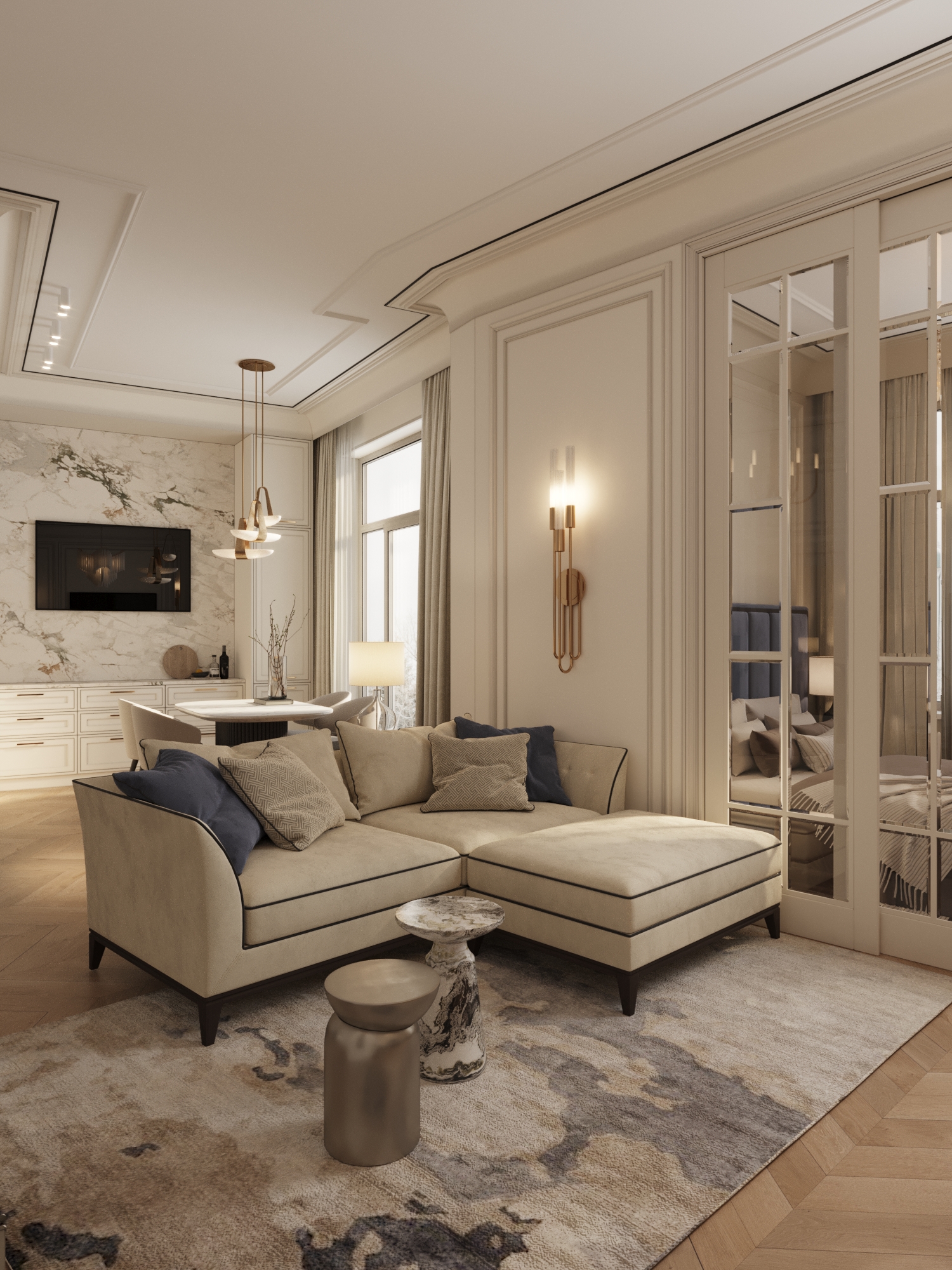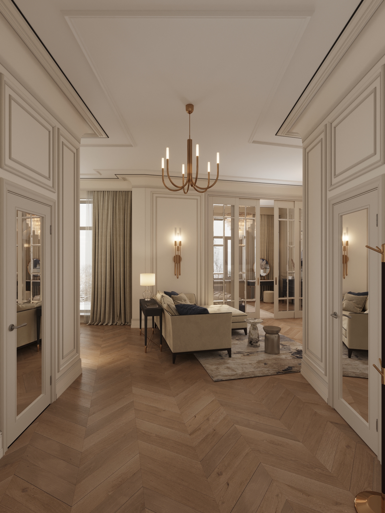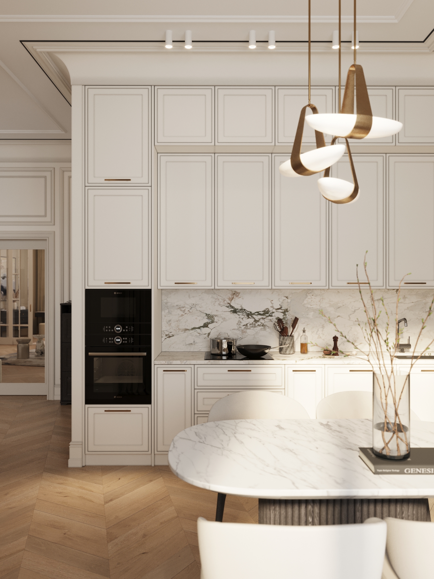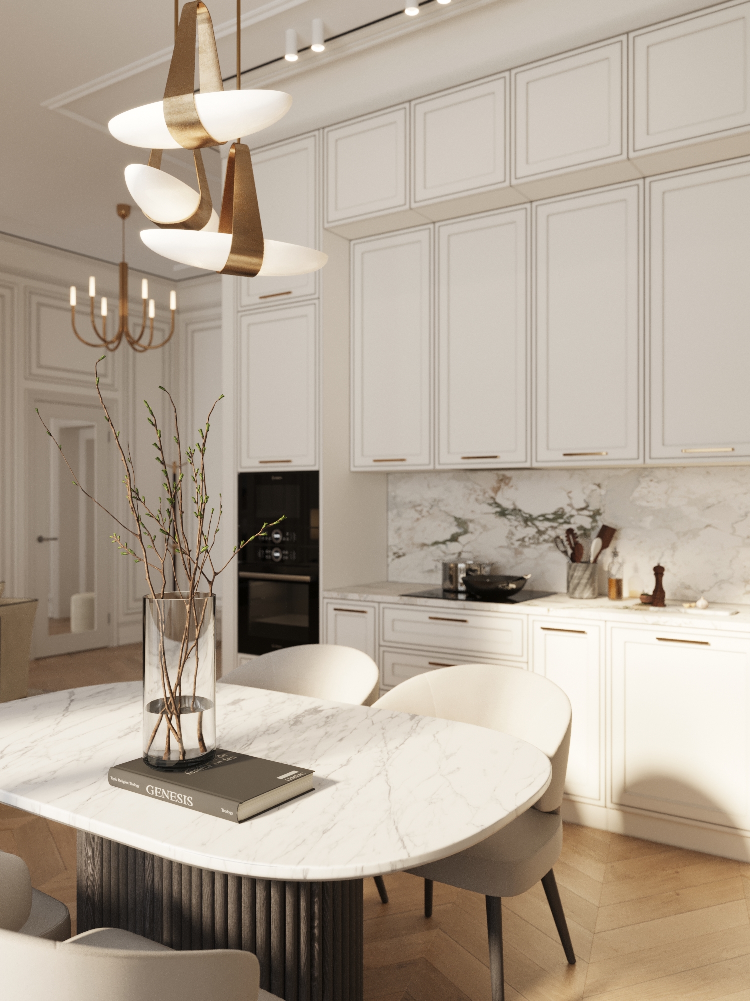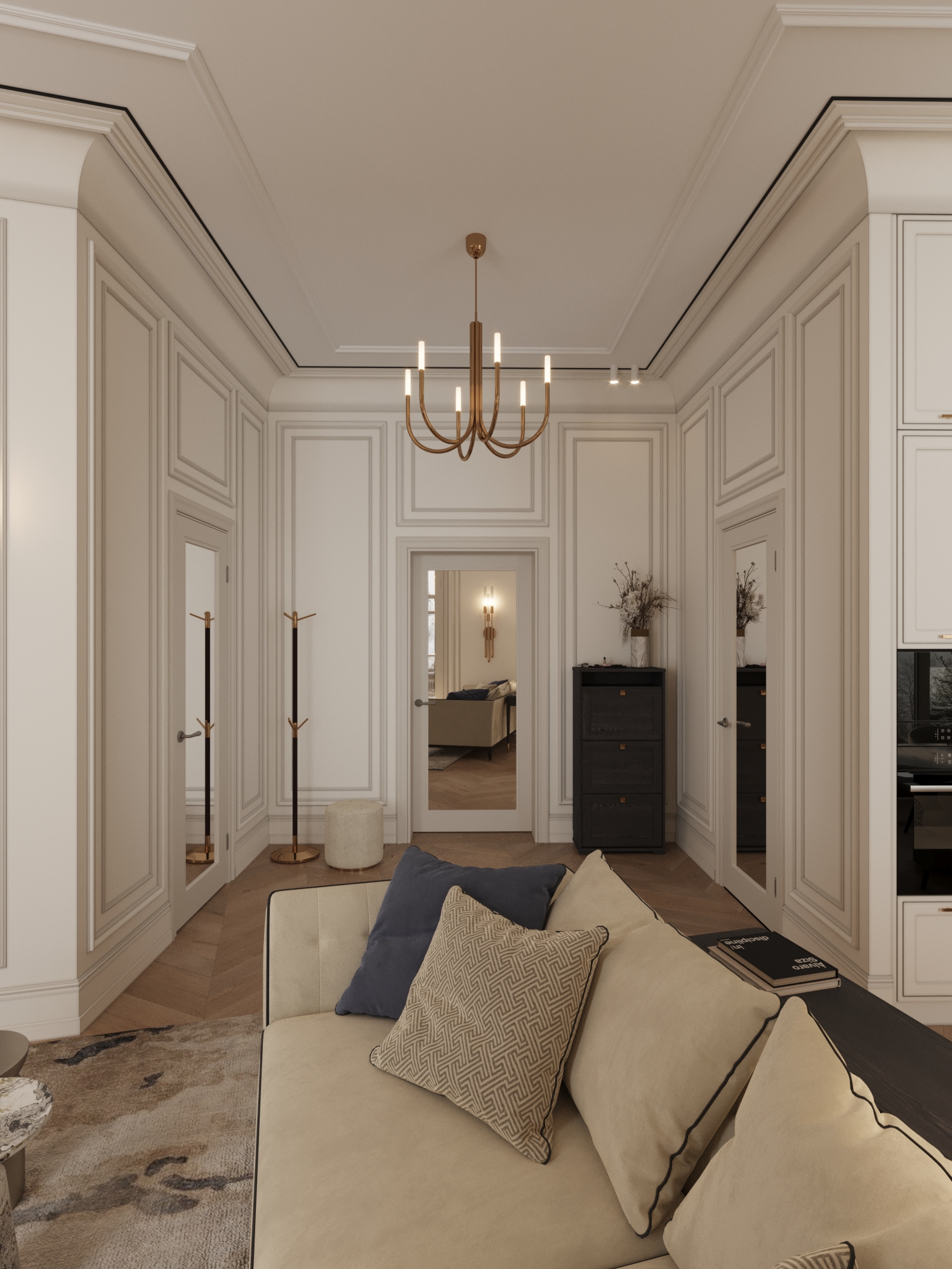 Квартира в классическом стиле, в благородных светлых оттенках с применением натуральных материалов.