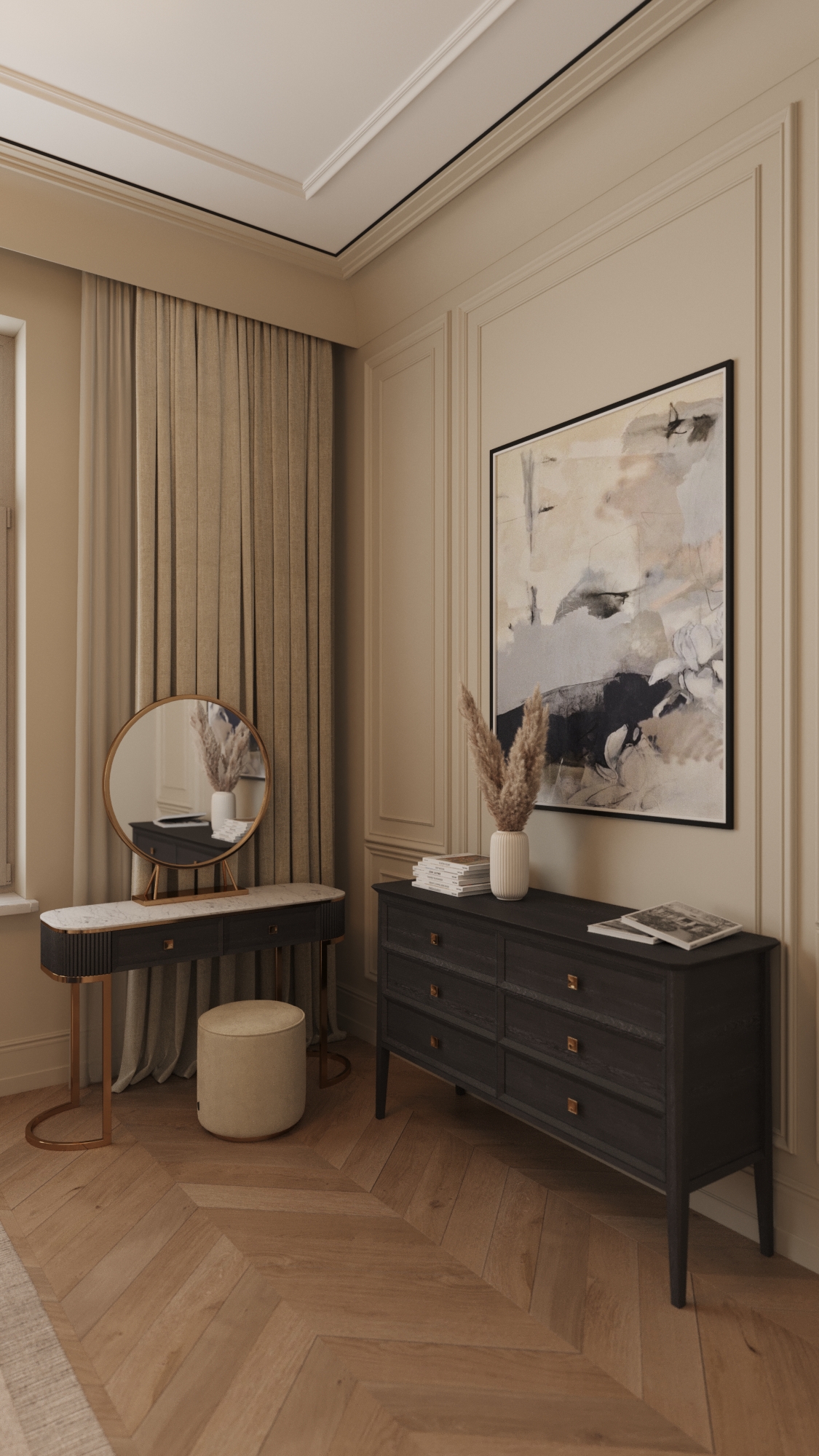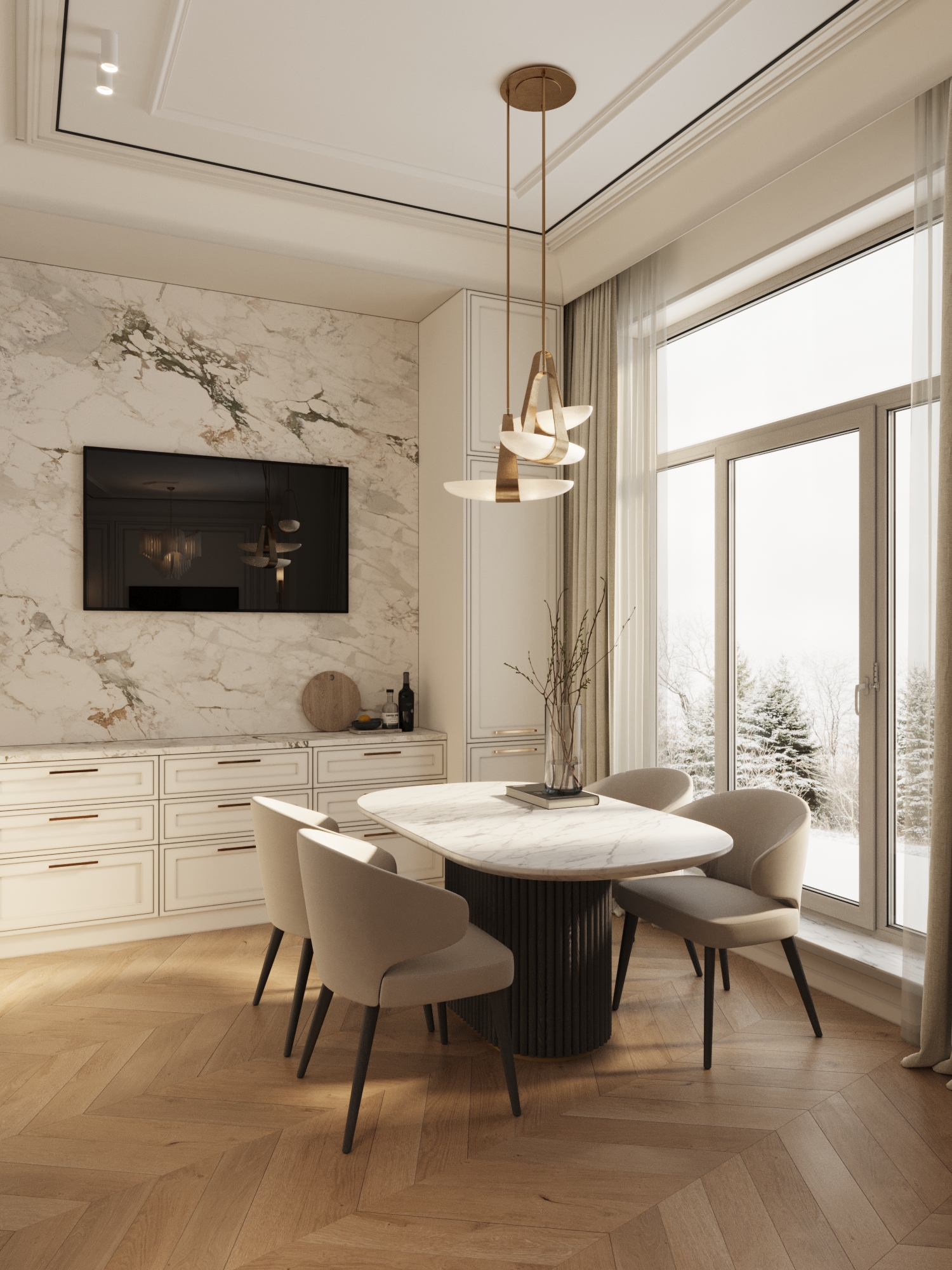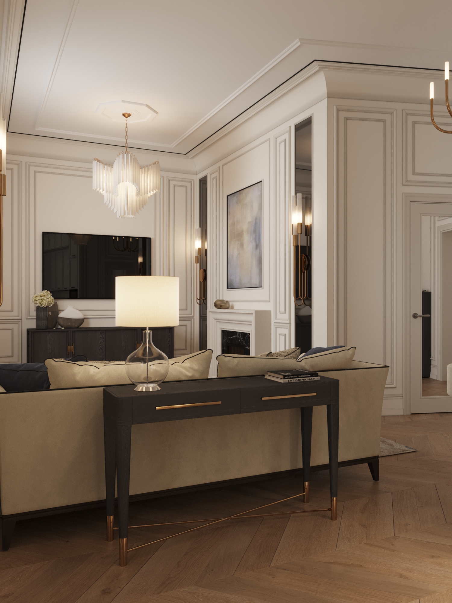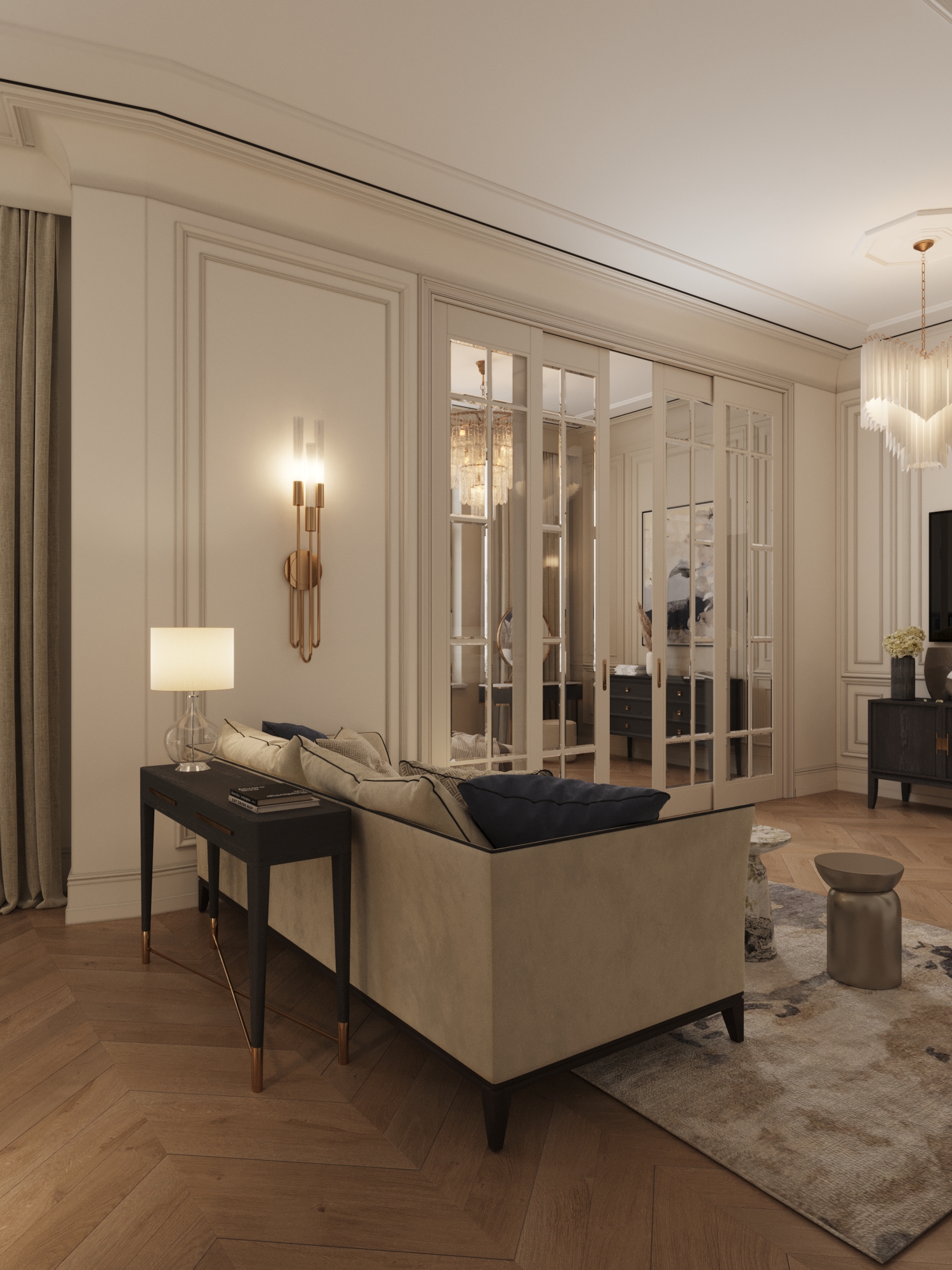 Квартира в классическом стиле, в благородных светлых оттенках с применением натуральных материалов.