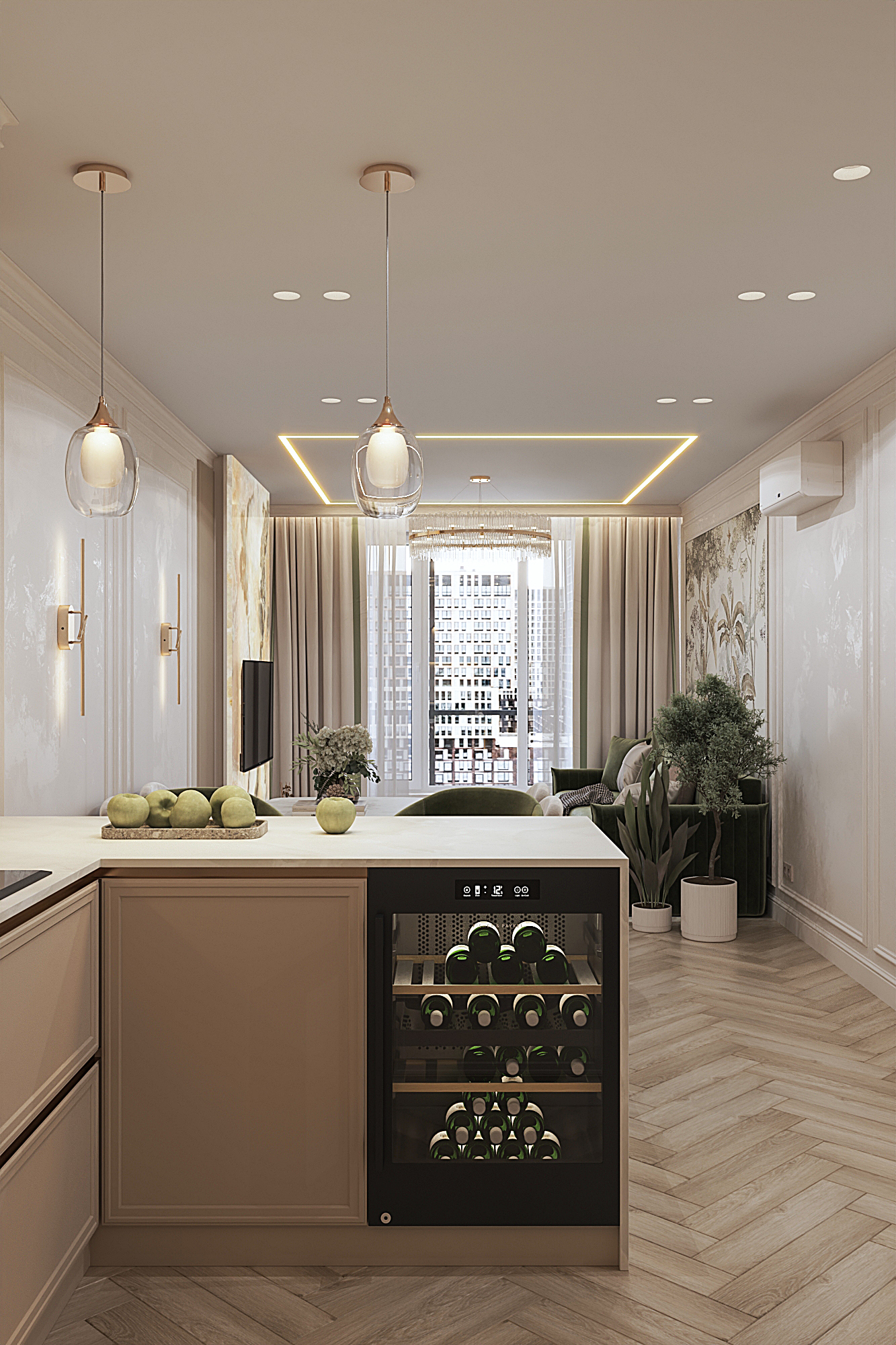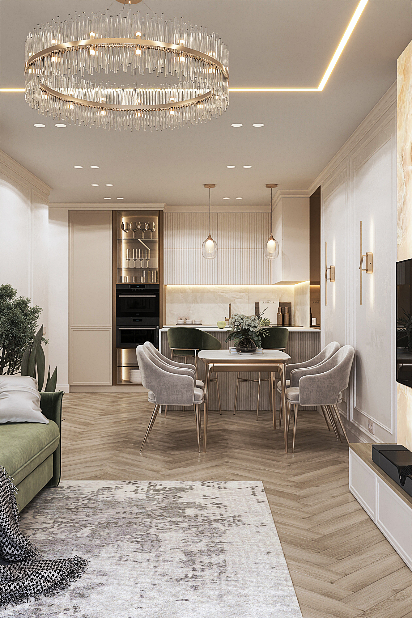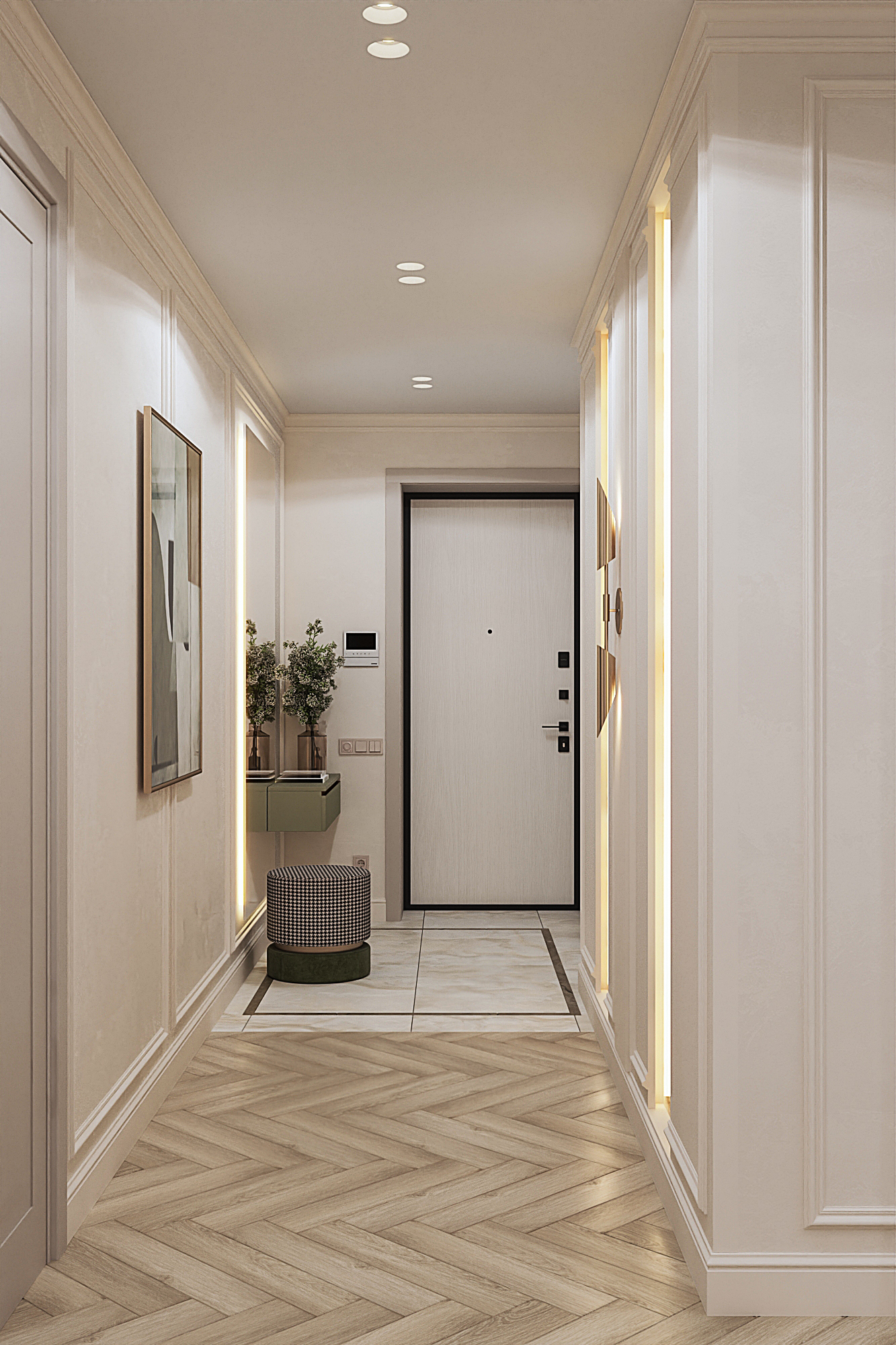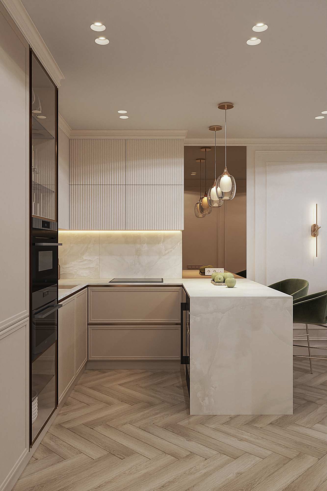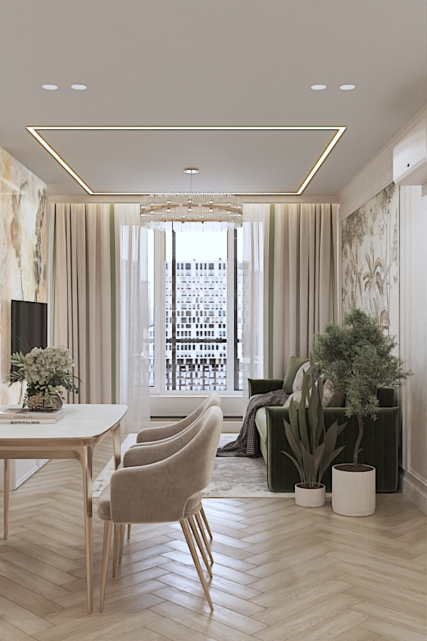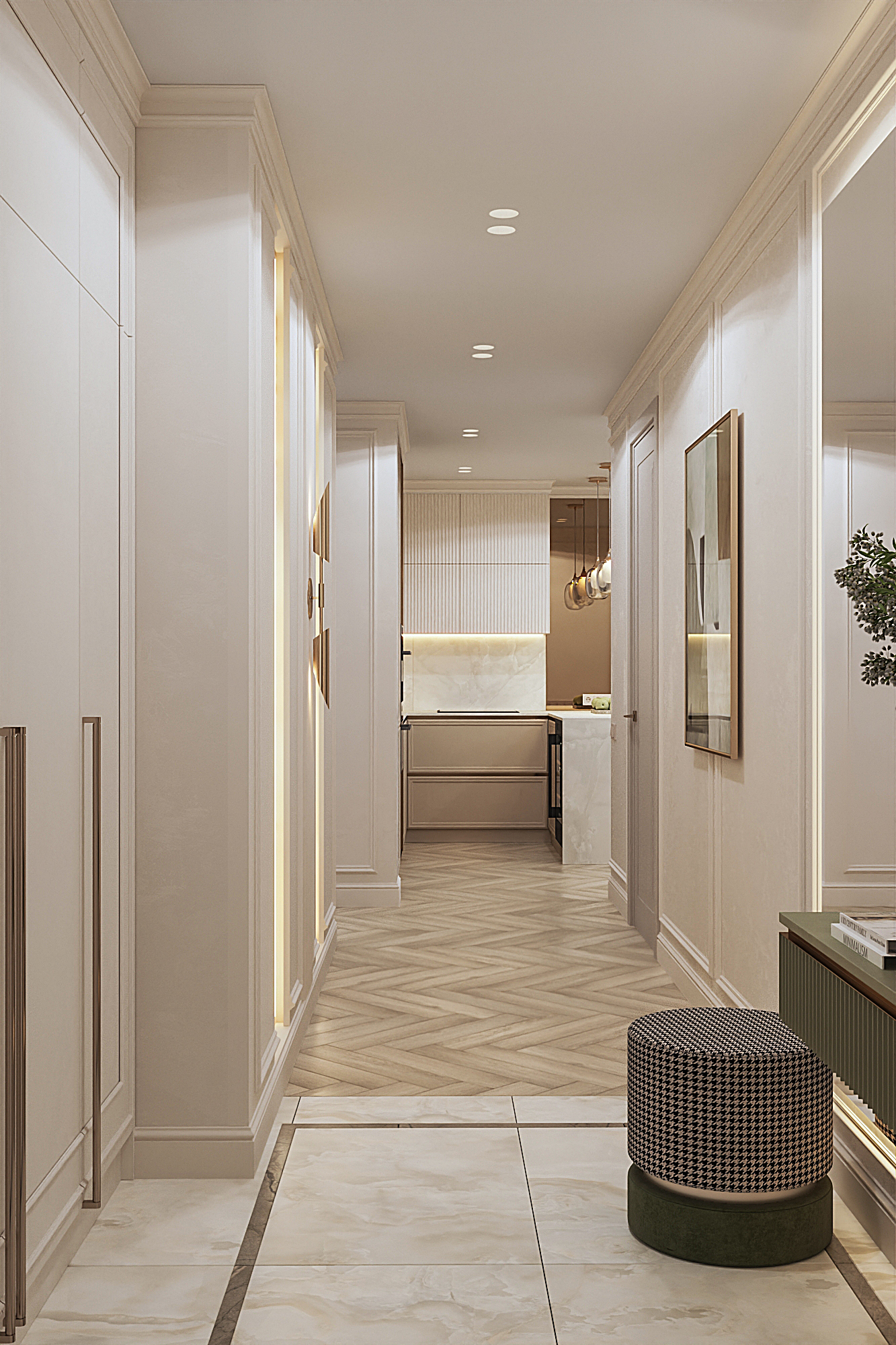 Дизайн квартиры для семьи с двумя детьми в стиле ардеко. Акцентом в дизайне стала композиция с использованием большеформатного керамогранита из белой глины, который пропускаеи мягкий свет. Теплая цветовая гамма, интересные декоративные решения создают сложное многослойное восприятие интерьера, который хочется рассматривать.